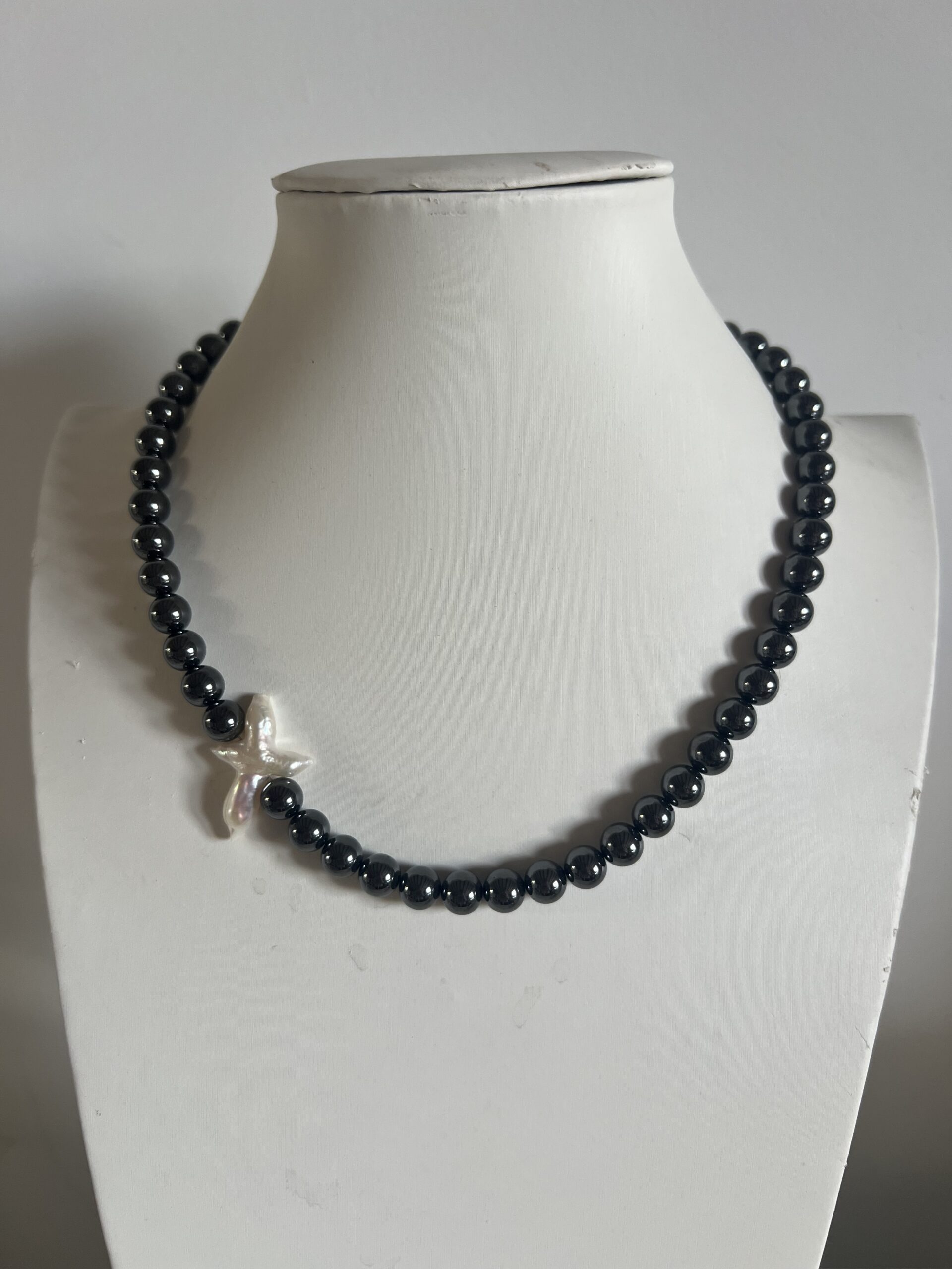 Be the first to review “Haematite Necklace with Kiss Pearl”