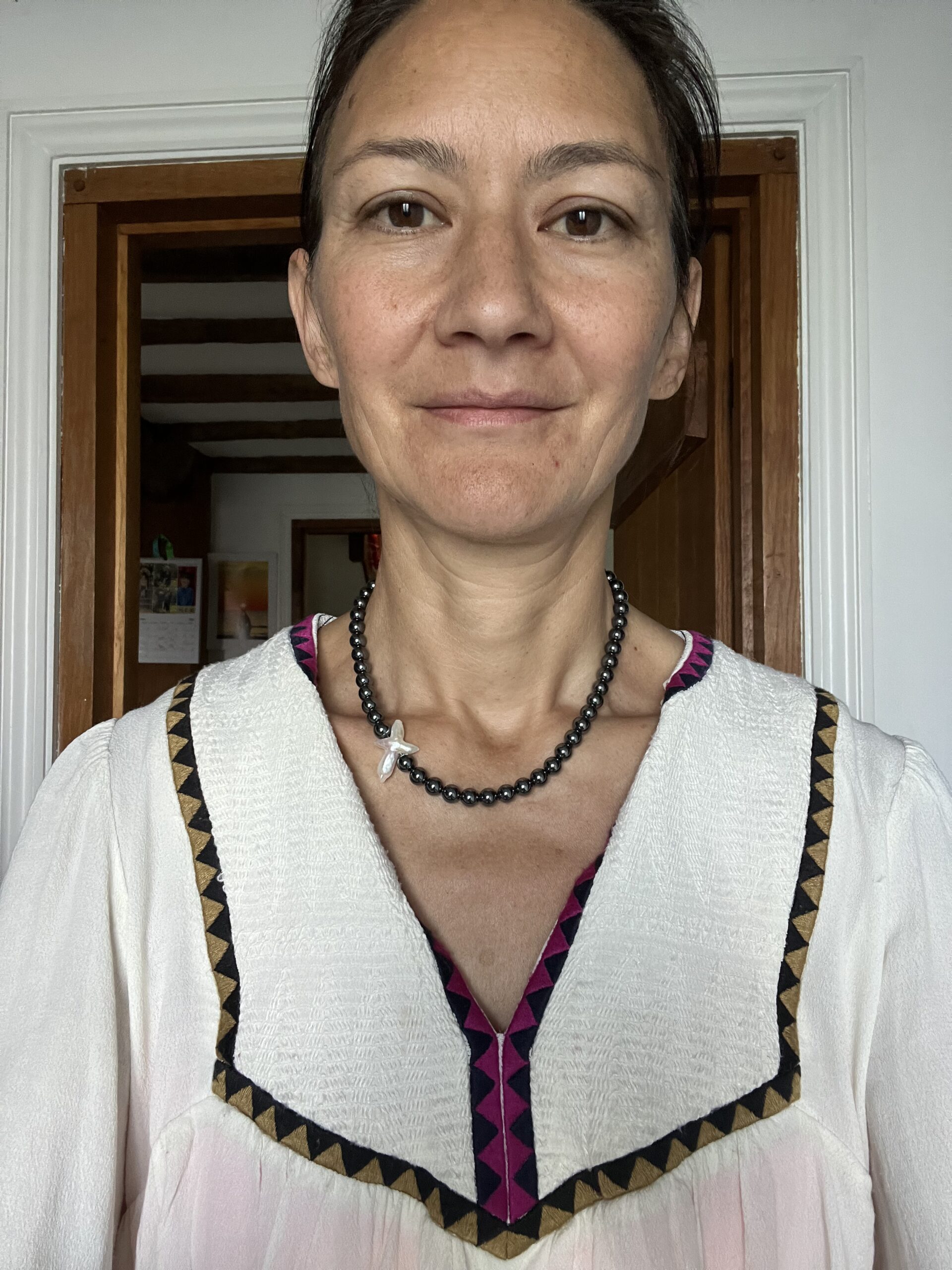 Grounded elegance with a touch of modern romance. This striking necklace features smooth, round haematite beads — known as the grounding stone for their stabilising, protective energy — paired with a single baroque pearl in a soft, organic “kiss” shape.