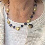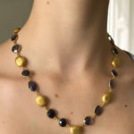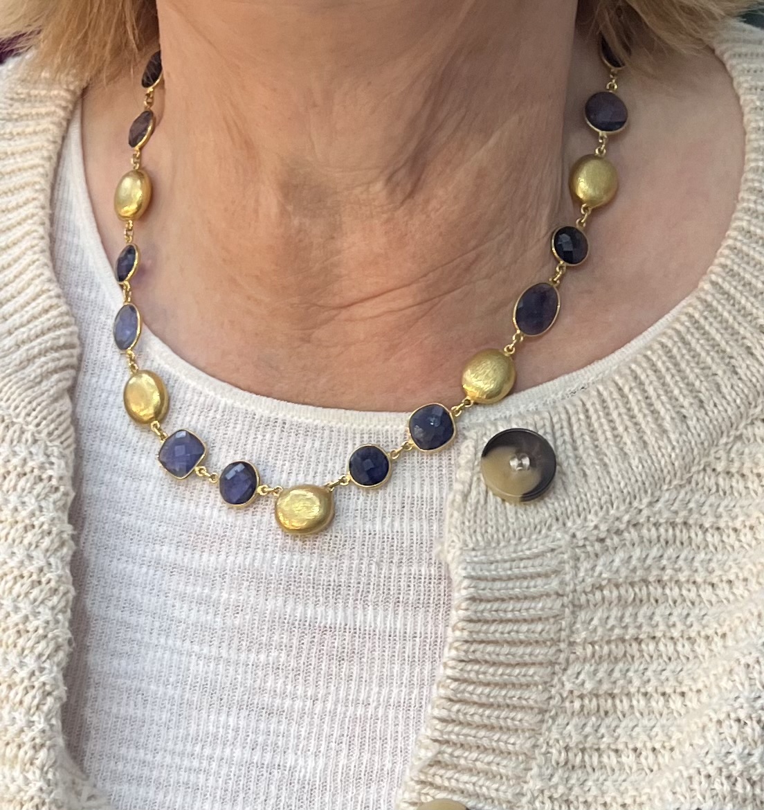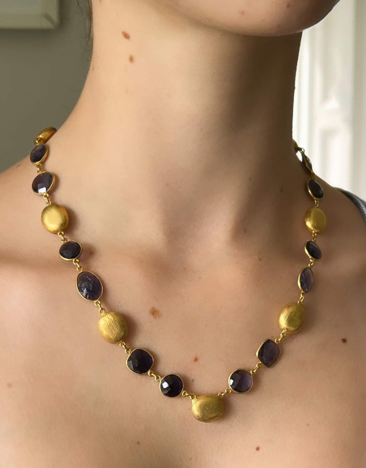 Elegant yet effortlessly striking, this necklace captures the quiet sophistication of timeless design. Deep violet-blue Iolite gemstones shimmer with subtle light, beautifully contrasted by softly brushed metal beads that add a modern, tactile finish.